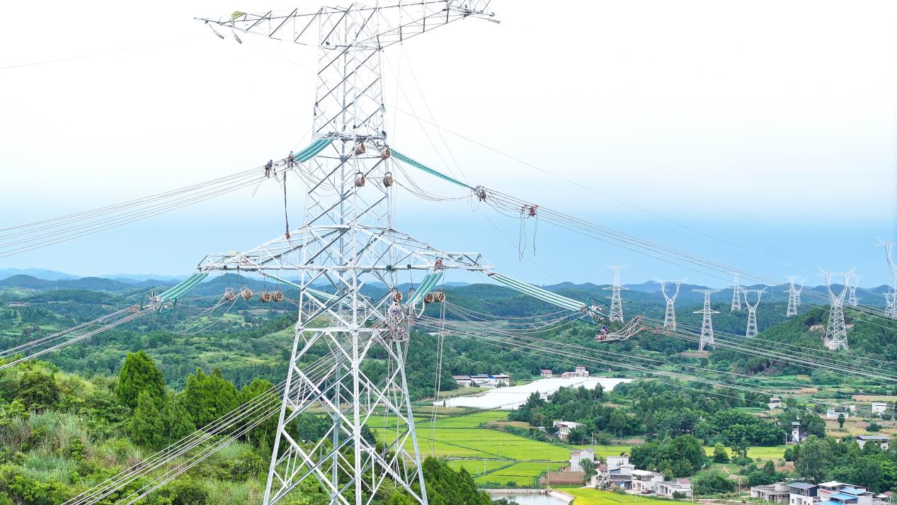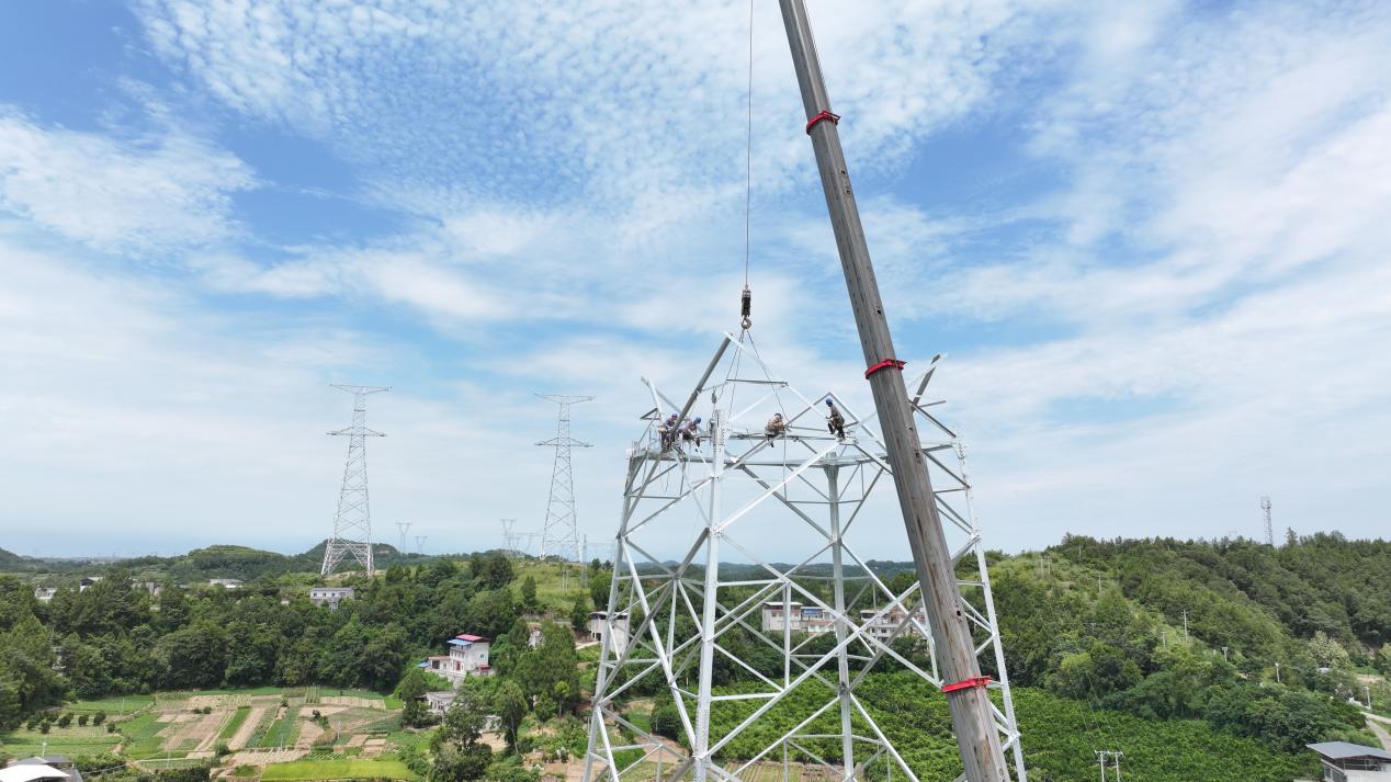 作业期间,工作人员克服暑热与降雨交替的恶劣天气,全天候坚守现场,经过8天连续奋战,安全高效地完成了首档架线任务。