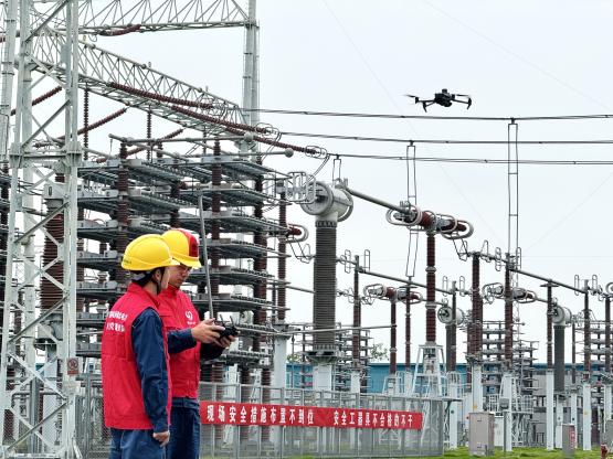 运维人员王文和曹博文通过无人机对站内设备进行精确测温。崔瑜珈 摄