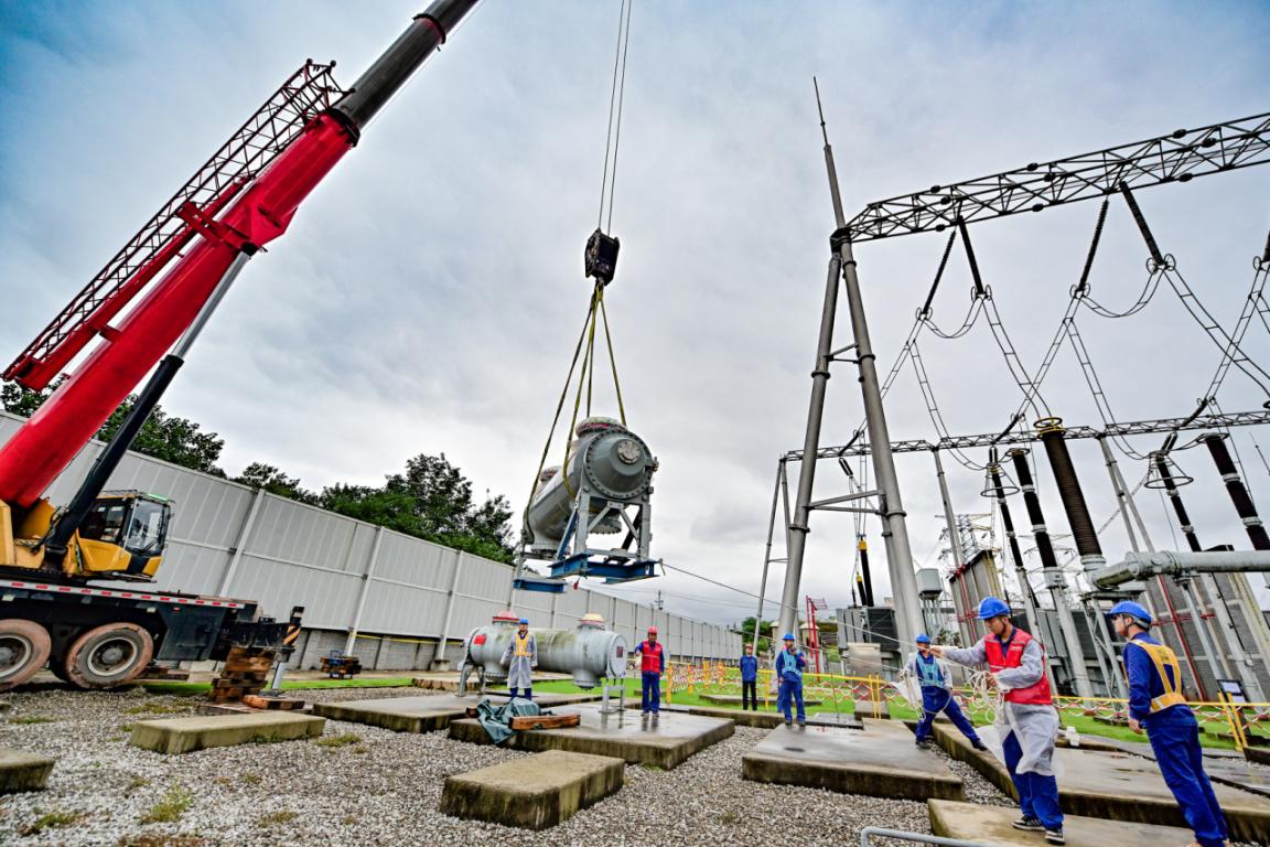 国网重庆超高压公司员工在500千伏玉屏变电站起吊500千伏新GIS断路器。刘玉峰 摄