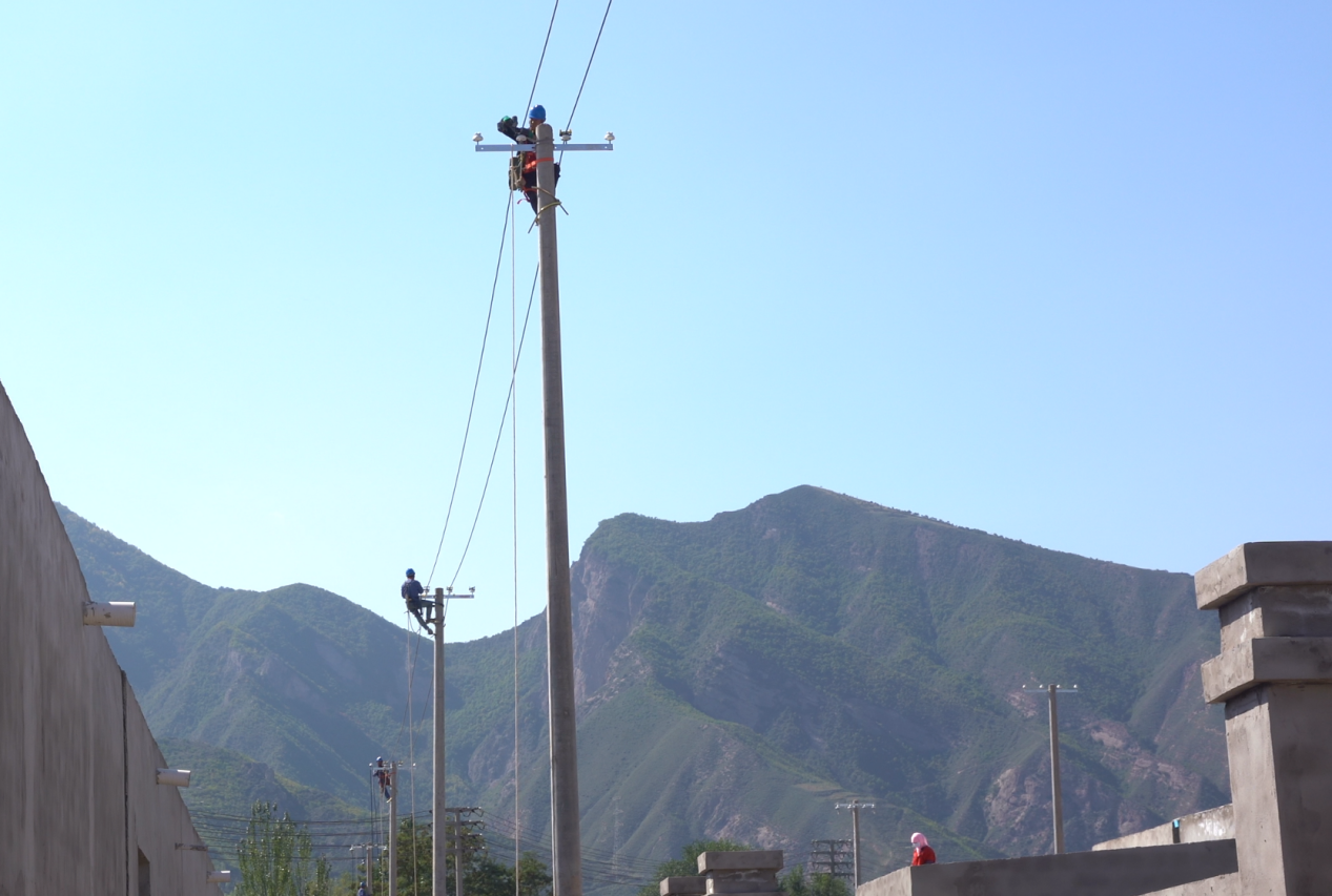 该公司电力施工人员在民和县马场垣乡地质灾害搬迁安置点进行线路放线施工。