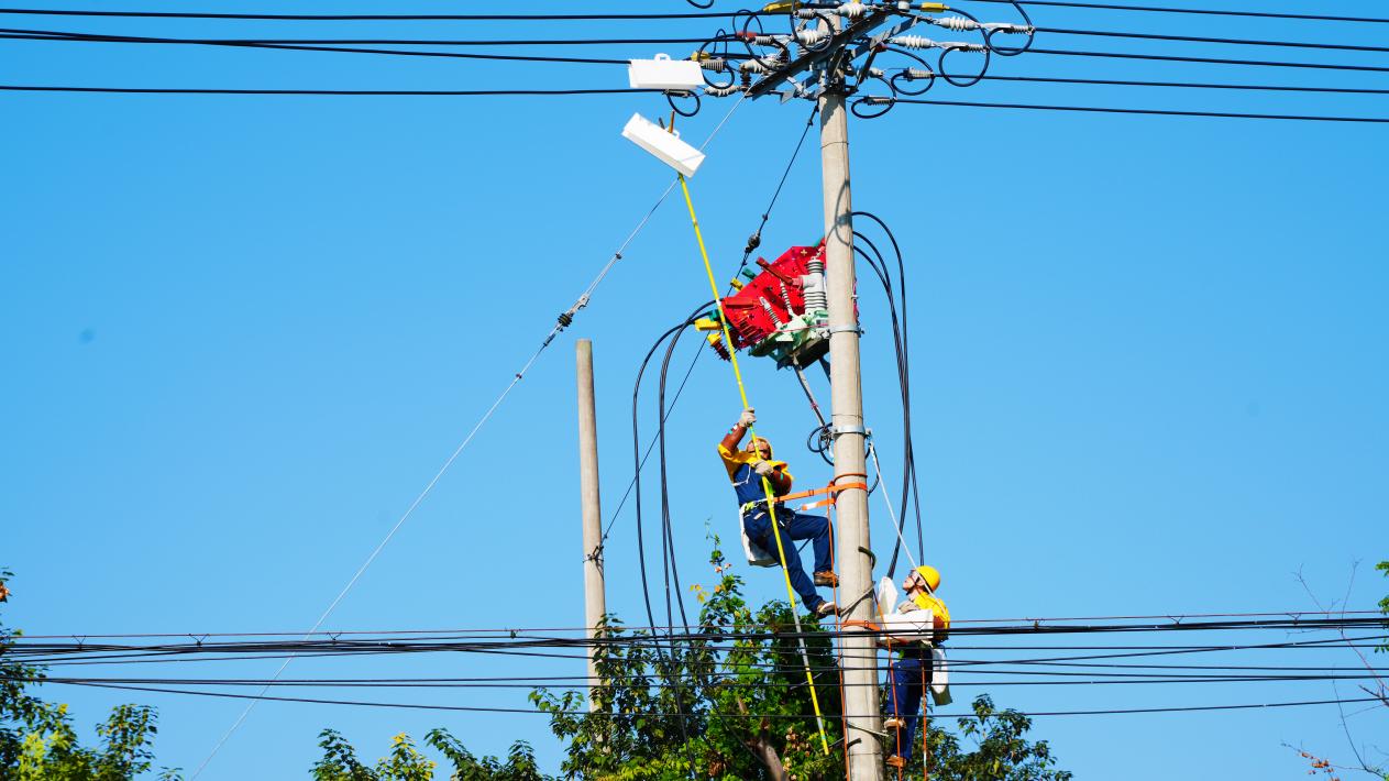 “往左一点。好,保持位置!”地面负责人的指令通过对讲机传达到高空。作业人员使用绝缘杆对带电导线进行严密的绝缘遮蔽,每一个动作都一丝不苟。现场工作人员徐哲描述:“这就像在高空穿针引线,只不过我们用的是绝缘工具,穿的是10千伏电线。”他们熟练地完成绝缘遮蔽工作,随后精准完成柱上智能开关的引线接入工作。现场工作负责人范亦天介绍,采用绝缘杆作业法,属于配网不停电作业中的复杂项目,对技术水平和操作规范要求极高。