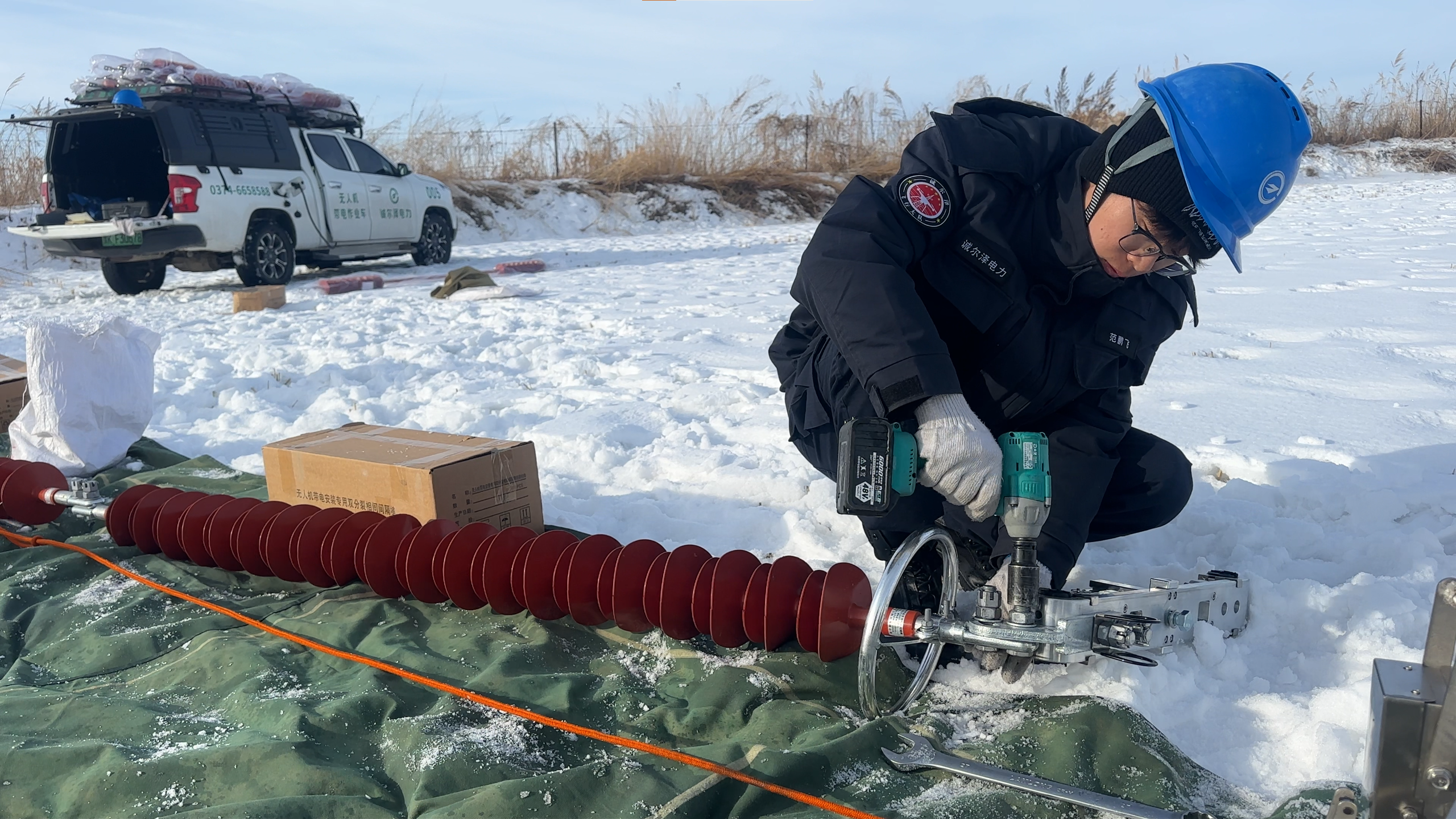 现场可见,两名技术人员在地面操控设备,单根双分裂间隔安装从起飞到完成仅用时约9分钟,较传统人工安装方式效率提升90%以上,现场人力投入减少一半。作业全程实现“线路不停电、人员零近电”,既杜绝高空坠落、触电等安全风险,又保障了线路持续稳定供电,完美适配边疆地区复杂作业环境。