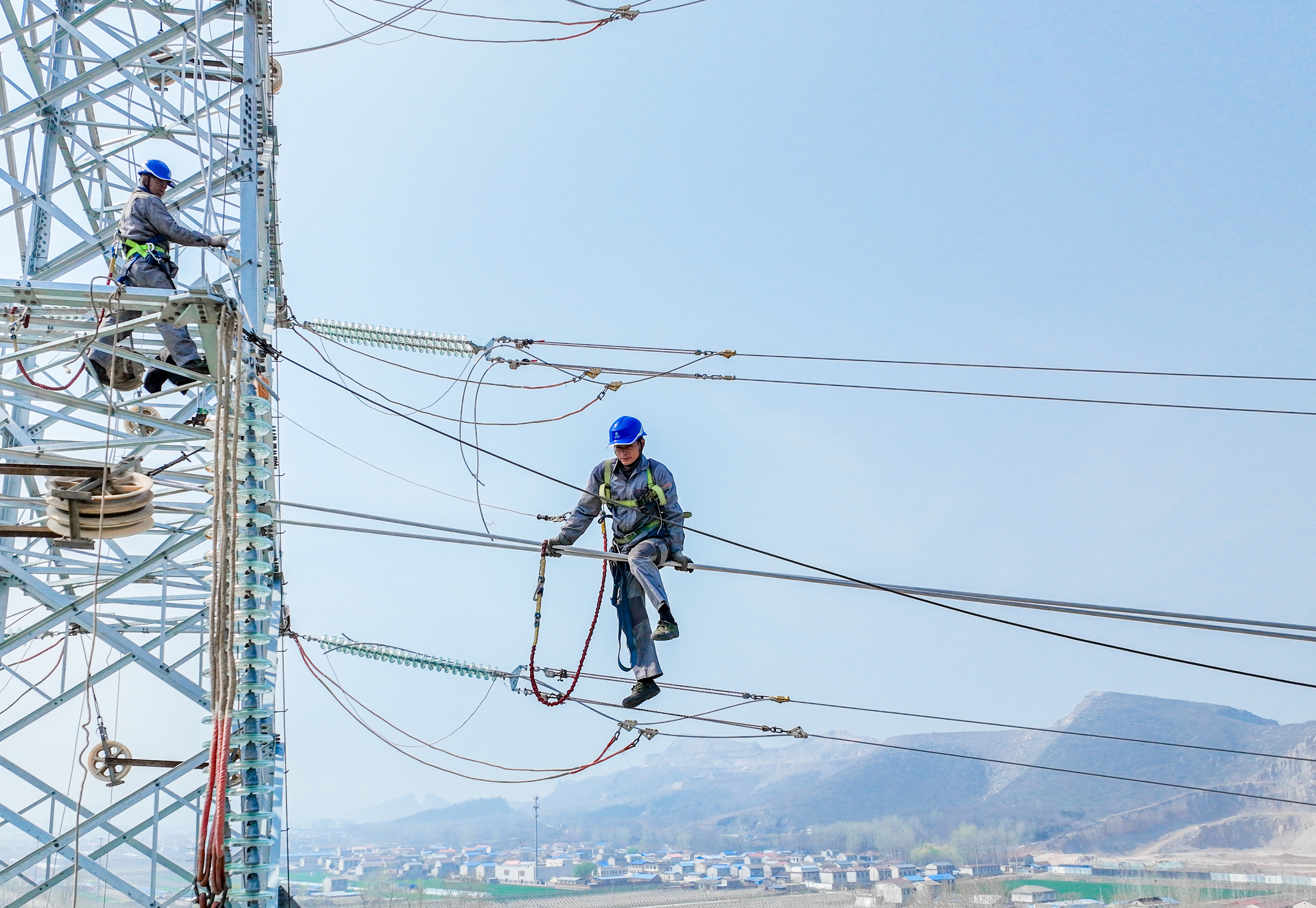 中国能源新闻网讯(马催 李伟)3月25日,在安徽淮北纵楼-陇海220千伏线路A67号铁塔张力场作业现场,电力施工人员正在有序开展导线展放作业。