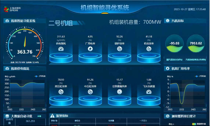 火电机组能耗态势将基于火电机组智能寻优系统进行升级研发,聚焦“一厂一策”要求,进一步加强智能管控。2023年,火电机组智能寻优系统成功应用于新昌发电分公司#2超超临界700兆瓦机组,在锅炉燃烧优化、冷端优化、运行绩效考核、全厂主辅设备能耗分析与经济指标计算等方面开展应用,实现降低机组供电煤耗约0.819 克/千瓦时。以标煤单价为1100元/吨、年利用小时为4500小时为例,该系统可为机组实现年增收约266.8万元。