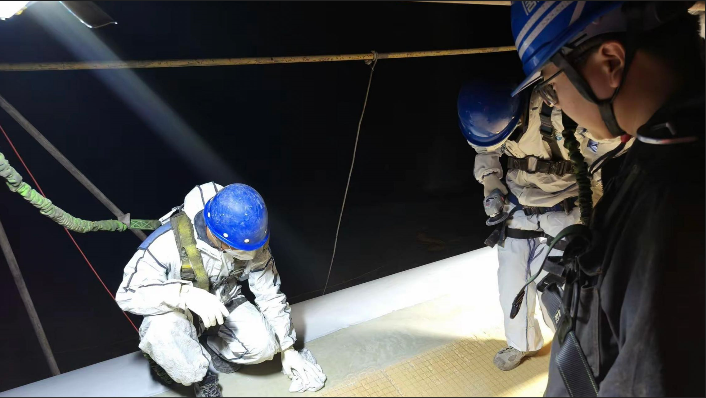 在黎明时分,刚有一线阳光洒落大地,他们已经开始穿上防护装备,投身于风机叶片维修的工作任务中。尽管高温下的工作环境极具挑战性,但工作人员们依然坚守岗位,穿着统一的工作服,戴安全帽,戴手套,遵循安全操作规程。