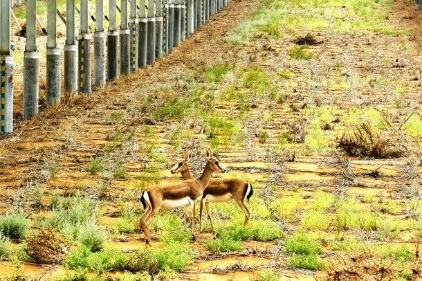 鹅喉羚属于国家二级保护动物,以青草等植物为食,因种群数量稀少被列入中国《国家重点保护野生动物名录》和《世界自然保护联盟(IUCN)濒危物种红色名录》。近年来,国能龙源电力在宁夏腾格里沙漠新能源基地实施“绿色能源+生态治理”开发模式,通过设置立体防沙障、铺设草方格、播撒草籽,栽植灌木等方式防沙治沙,使这片曾经风吹沙跑的沙漠植被覆盖率从0.5%增加至15%~20%,为野生动物提供了食物充足、荫凉遍地的新栖息地,吸引了鹅喉羚、鸽子等众多野生动物前来觅食,推动区域生态环境持续向好。