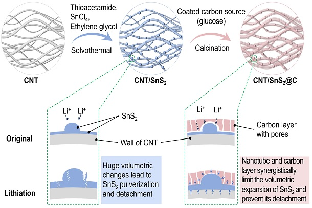 图为碳纳米管/二硫化锡@碳的制备示意图和二硫化锡层在不同体积状态下的比较