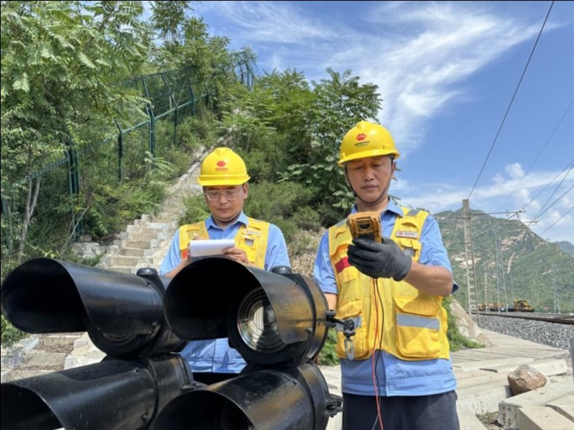 在D6号信号处,班组职工甄耀半蹲着身子,用棉纱轻轻擦拭着信号灯玻璃。与他同行的职工赵芮康也不闲着,拿出扳手逐一紧固基础螺栓。俩人做完放下手中的工具,甄耀拿出钥匙打开红灯后盖信号锁,赵芮康伸手拿出万用表递了过去,甄耀接过万用表,神情专注地测试起来。赵芮康从电缆盒中取出测试记录本,甄耀测试一个数据,赵芮康记录一个,两人的默契配合天衣无缝、相得益彰。