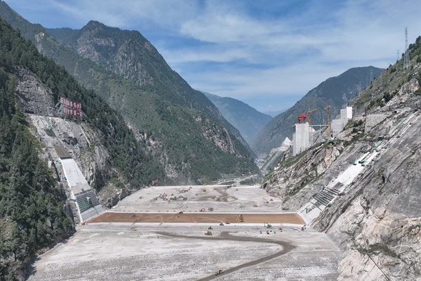 图为双江口水电站大坝填筑现场