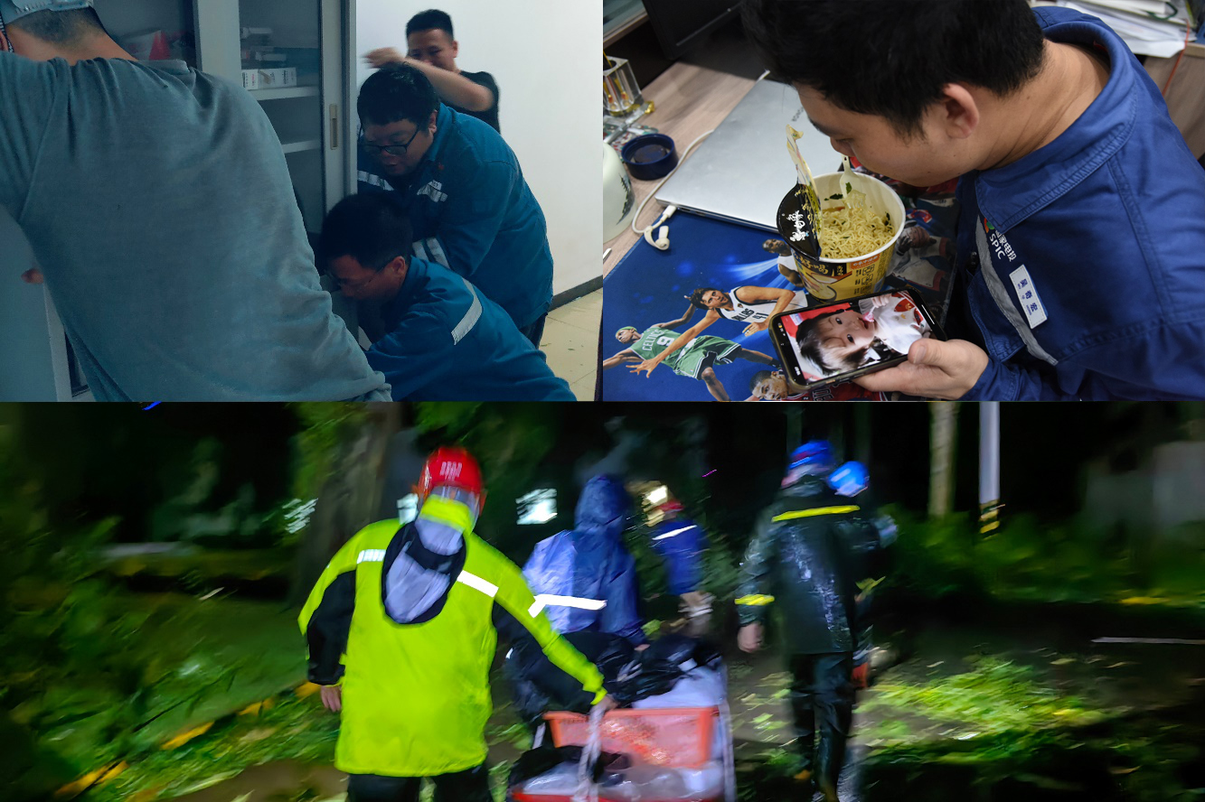 风雨中紧贴墙根,彻夜为柴油发电机补油;数人齐心,用柜子紧堵大门;深夜党员带头护送饭菜于风雨中;值班人员抢抓台风眼时机,冲到现场查看情况;坚守岗位数日不曾回家……
