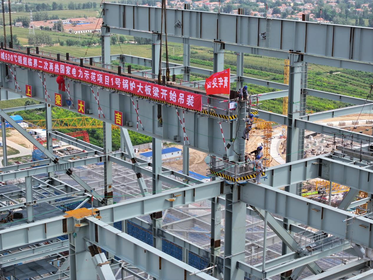 前不久,随着工程现场指挥人员一声令下,一根长39.1米、重达146吨的大板梁从地面徐徐升起,平稳就位于大唐郓城示范项目1号机组锅炉85.2米高的钢架上,标志着世界首台630℃超超临界二次再热燃煤发电机组正式进入设备安装阶段,建成后将刷新世界火电机组二次再热最高汽温纪录。