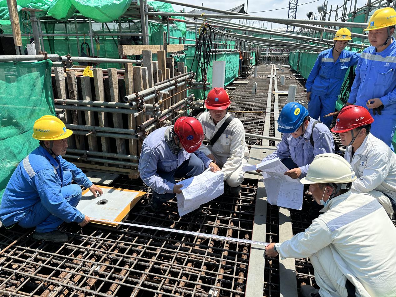 稳固质量基石,精益求精。项目部始终做到“严慎细实”,在多次专项培训交底中,确保人员具备高水平浇筑相关的技能,从细微的数据测量到详尽的记录审核,每一环节均经严格自查,顺利完成了汽机台板浇筑前的验收。浇筑前仔细检查模板、钢筋、埋件,确保基础稳固;浇筑时,精准调控混凝土配比与浇筑速率,严格控制振捣频次,保障结构均匀密实;浇筑后,及时进行混凝土养护并监测温度变化,有效杜绝裂缝风险。