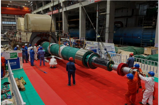 该厂选用水氢氢冷自并励静励磁的汽轮发电机,转子长约15.4米、最大直径约1.25米、重达96吨,作为发电机核心部件,发电机穿转子是发电机安装中最为关键的一环,转子先后通过阻抗、耐压、通风等多项重要试验后,该厂组织施工人员对定子膛内进行全方位检查和清理,为穿转子作业做好前期准备。在面对精度高、操作稳、控平衡等高要求高标准下,为确保穿装工作顺利完成,该厂会同参建各方提前策划、周密部署,派遣专人跟踪设备出厂监造情况,同时对设备接卸、吊装、就位等工作组织专题策划,进行全面论证和优化。穿装前,该厂组织全部施工人员及安全人员进行安全技术交底,明确人员分工和安全责任,为穿转子的顺利进行做足安全保障。在经历提升、平移、穿入一系列的精准操作,过程严密监视发电机汽励两端定转子、转子护环、端部线圈等重要部位,及时调整发电机定、转子间隙,防止发生刮擦碰摩,转子最终被平稳而精准地推进并安装到位,整个过程连贯顺畅、安全稳定,实现了转子的一次性成功安装,圆满完成了转子入膛。
