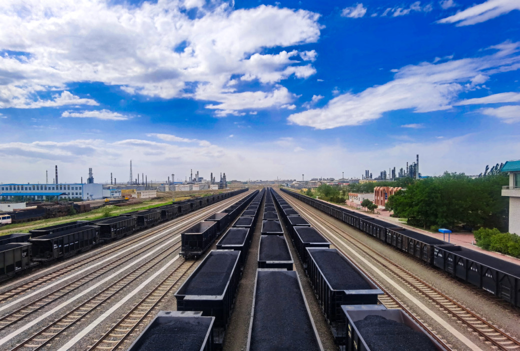 满载煤炭资源的货运列车。