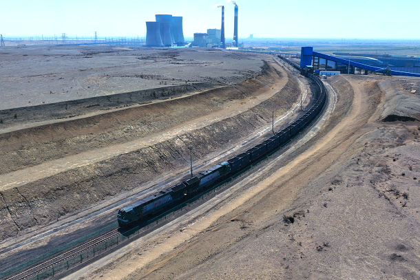 满载煤炭的保供专列驶出准东露天煤矿。