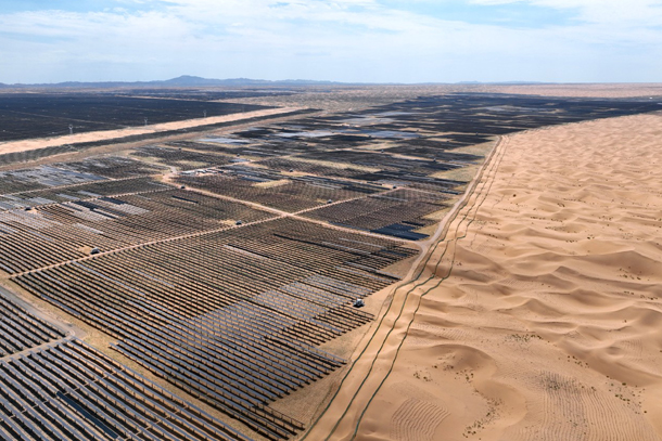 龙源电力坚持创新驱动发展理念,在腾格里“沙戈荒”新能源基地协同推进生态治理与能源开发。创新运用建筑信息模型(BIM)技术,实现工程建设全生命周期数字化管控;应用国内领先的单晶双面双玻N型Topcon光伏组件,配合平单轴自动追光系统,最大化捕获光能;清扫无人机定时除尘,确保发电效率,设备整体效率较常规方案提升10%以上。目前,腾格里光伏矩阵正在加速扩围,一座座巨型风机正在拔地而起,“沙戈荒”正在蝶变为“阳光银行”与“风电森林”,为“双碳”目标注入磅礴绿能。