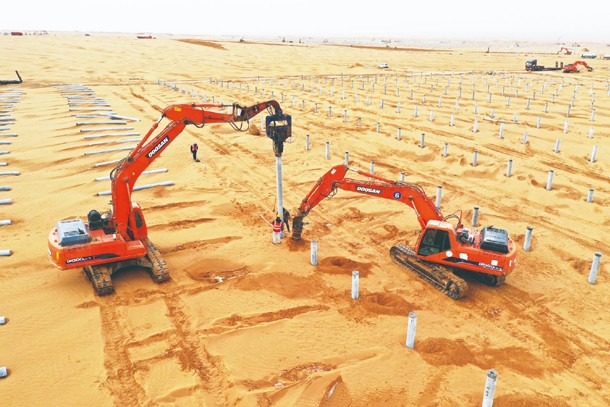值得一提的是,2023年4月首期并网的100万千瓦光伏项目,仅用四个月就完成了工程建设,打破了一系列纪录:10天,2.8万亩沙丘夷为平地;28天,330千伏升压站土建工程完成;60天,330千伏升压站电气安装完成;70天,330千伏送出线路144基铁塔组立,51公里导线展放完工;90天,33万根PHC管桩施工、220余万块光伏组件安装完成……一串串跃动的鲜活数字,见证着国家能源集团龙源电力在基地建设中书写的新传奇、跑出的新速度,彰显着广大干部职工笃行实干的优良精神传承,生动诠释着“不到长城非好汉”的拼搏精神。