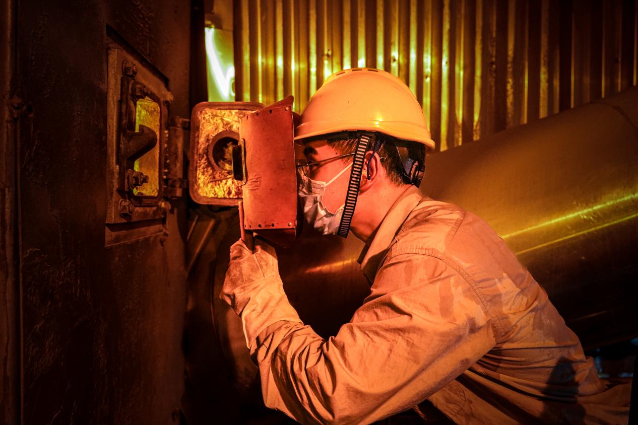图为北仑电厂运行人员正在观火。
