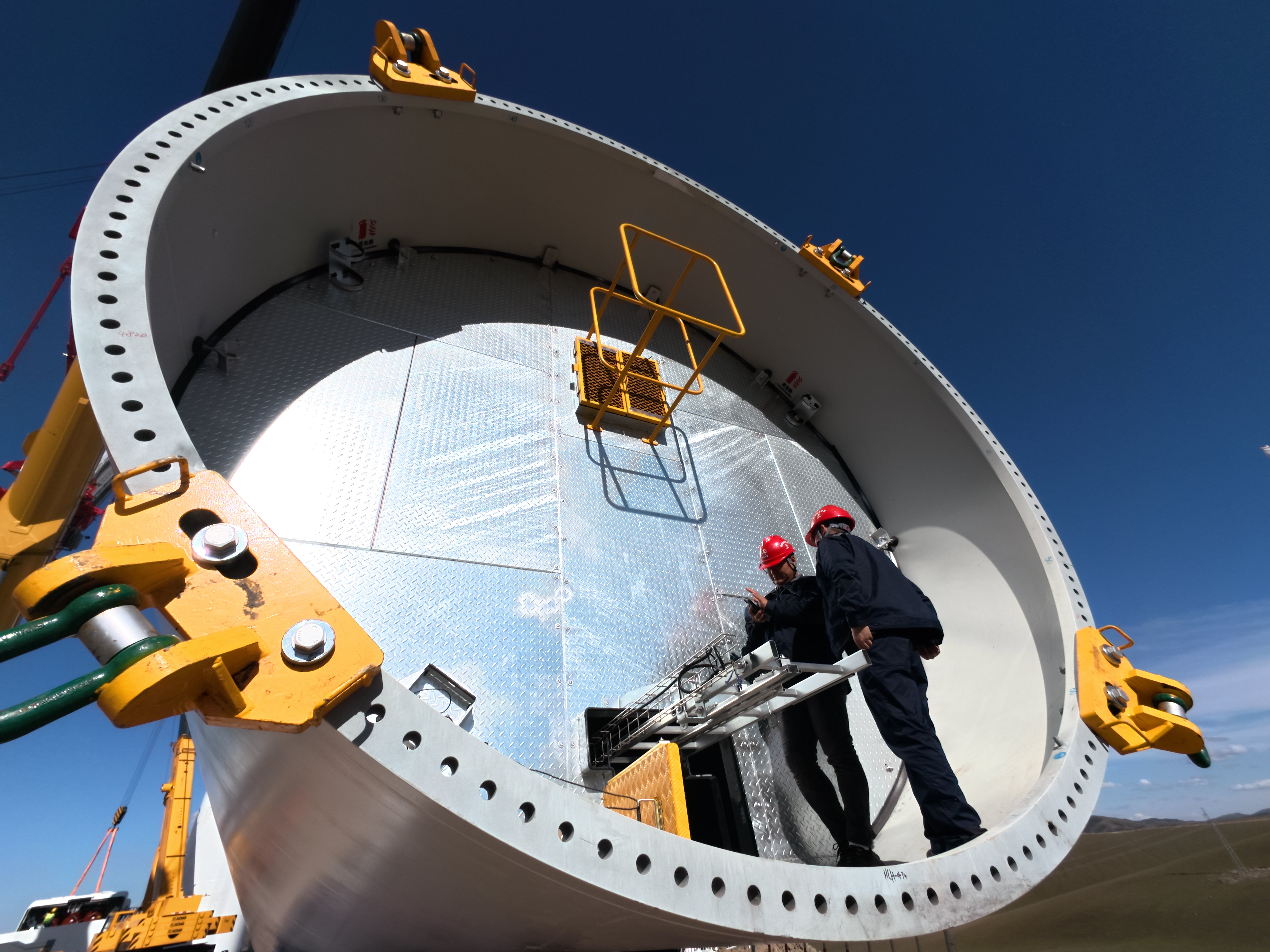 该项目在设备选型与技术应用等方面实现了多重创新。项目选用20台10兆瓦风电机组,该机型塔筒高度达到125米,叶轮直径突破230米,是内蒙古公司系统内单机容量最大、塔筒最高、叶片最长的风电机型。
