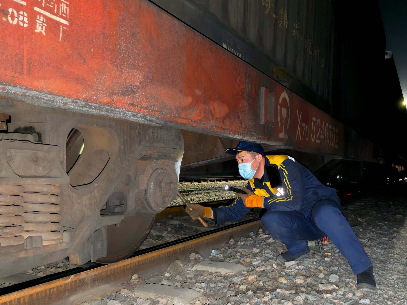 寒夜的股道上,钢轨在灯光下泛着冷光,检车员的身影在列车旁穿梭。“大沙沟列检是疆煤进宁的第一道安全关口,容不得半点马虎。”张泽介绍,每一趟列车进站,3名检车员会分段检查,一人负责一节,绕车检查一圈至少50分钟,加上往返股道的15分钟,一趟作业下来,队员们要在寒风中作业一个多小时。检查的重点聚焦“五防”,车钩连挂是否牢固、转向架的车轮与侧架有无隐患、基础制动装置的杠杆上拉杆与开口销是否完好,还有车辆装载加固状态、车体是否倾斜外胀,每一个细节都要反复确认。“最近一晚最多要检查八趟列车,光往返走路就将近20公里,有时手冻僵了,就哈口气暖一暖继续干,作业不能停。”张泽说道。