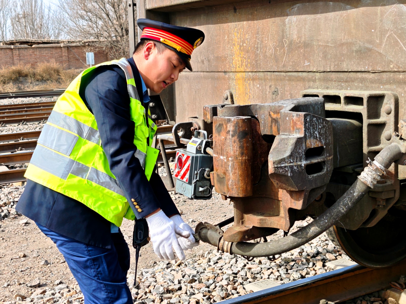 大沙沟站检车员在进行列车检查作业。