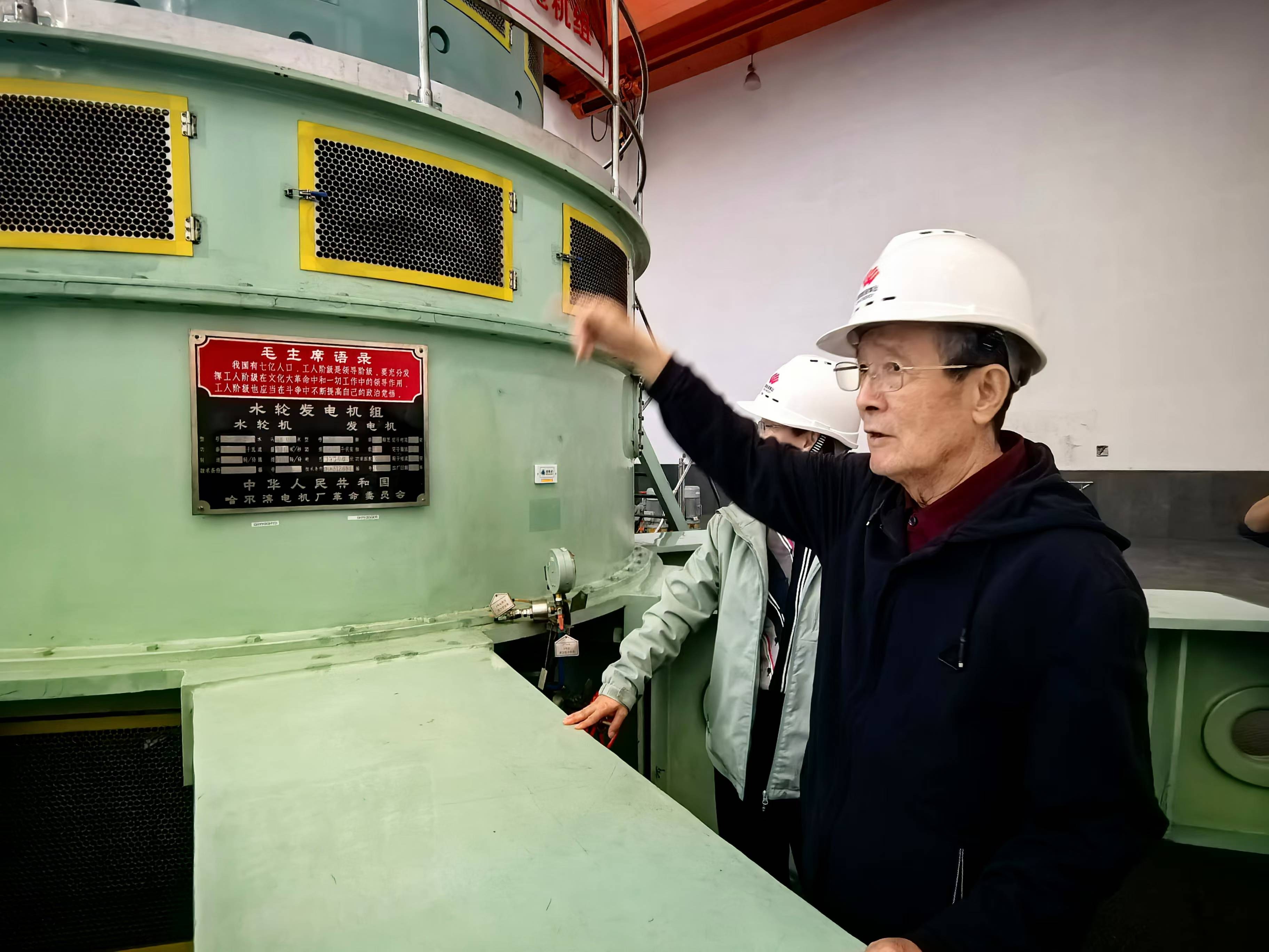 退休职工站在至今仍继续投运的机组前,介绍毛主席语录。