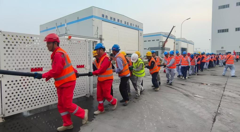 在按核电流程完成安全技术交底后,各支党员队伍按照任务布置进入到各自区域,党员同志们纷纷摩拳擦掌,准备着一场硬仗,毕竟这根动缆犹如一只“黑蟒蛇”,想要“驯服它”可不容易。一开始,沉重的电缆压得人走路摇摇晃晃,加上拐弯多,走走停停的敷设并不流畅,大家都咬紧牙关坚持着,几个经验丰富的老书记一合计,分段在拐弯处留足电缆长度,并带头喊起号子,大家一起使劲前拉后送,“黑蟒蛇”逐渐变得“温顺”起来,经过一个多小时的奋战,终于顺利完成电缆敷设任务。