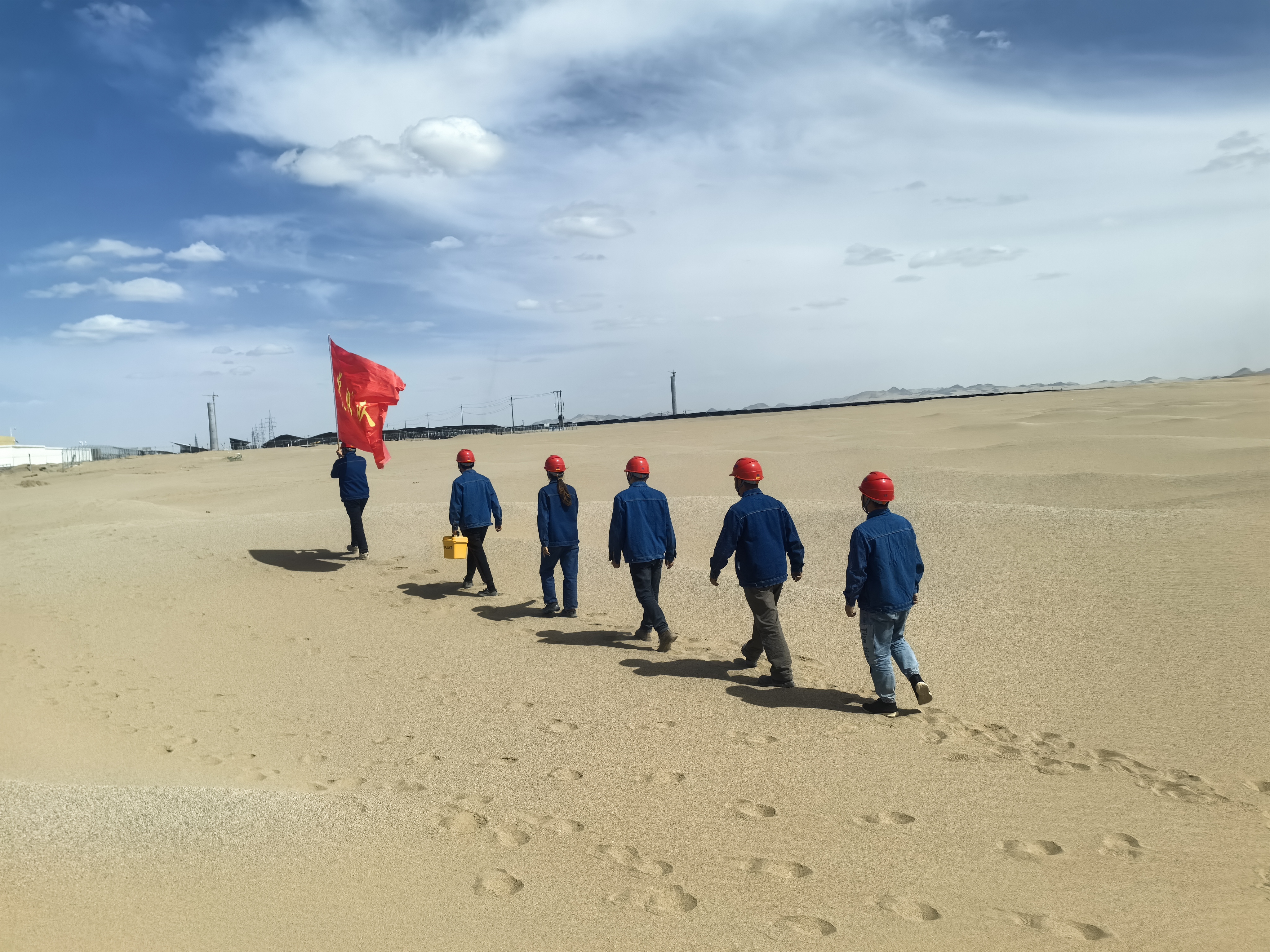 党员先锋队队员跋涉于气候环境恶劣的沙漠环境中。