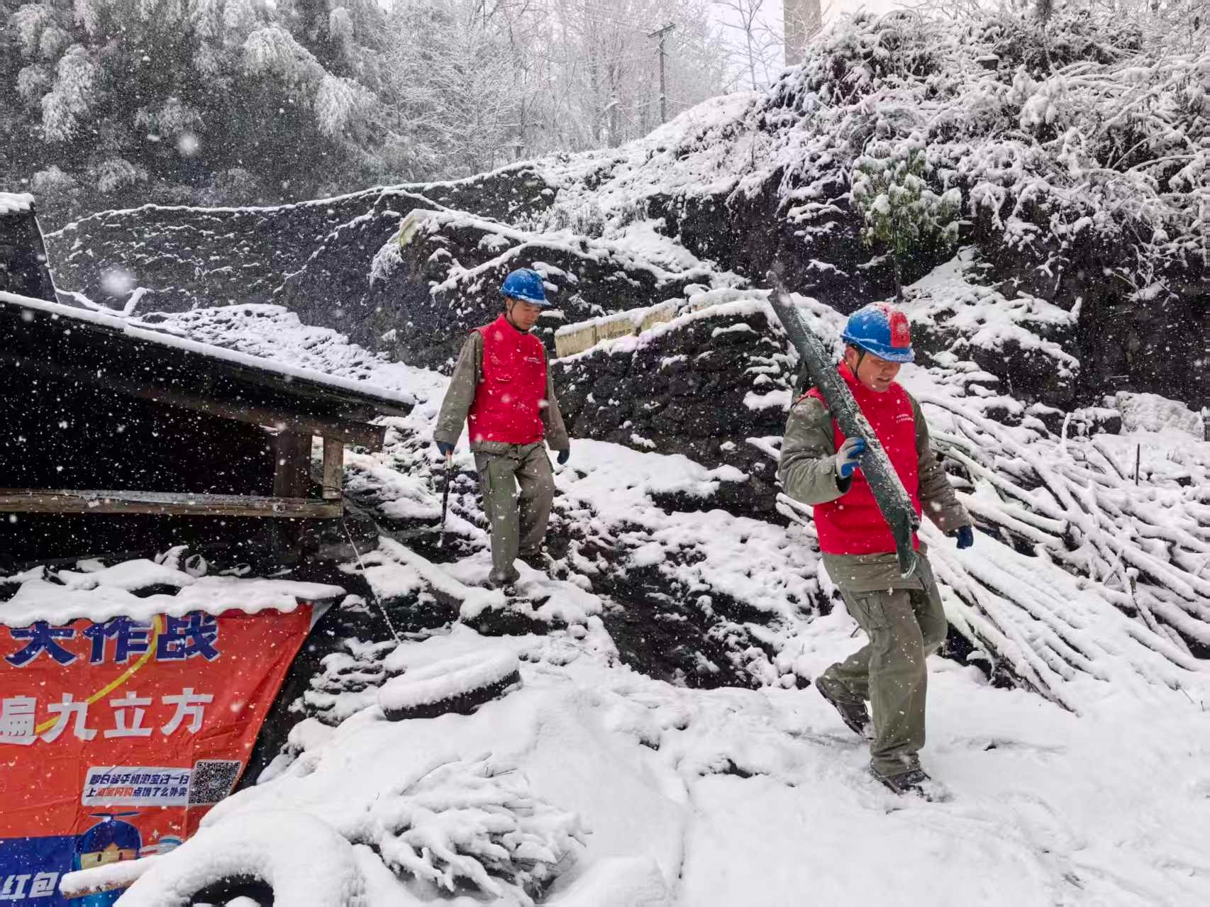31日清晨,建始县官店镇后坪村,皑皑白雪中,一队头戴蓝色安全帽,身着“鄂电红马甲”的电力工人格外引人注目,他们踏雪行走在崎岖不平的山路上,沿10千伏官红线照京坪六组公变线路开展特巡。队员们在山林小路互相搀扶踏雪前行,完全不顾风雪浸袭,逐杆对导线、金具和绝缘子积雪覆冰情况进行仔细检查,对转角拉线进行加固,并在行进过程中对线路附近折断倒伏的树木枯枝进行处理,不放过任何一处细节,全面排除隐患缺陷。而在海拔较低的红岩镇,红岩供电所员工汪启雄、欧阳青昀等冒雪登杆为百草池公变用户更换进户线,完全顾不上艰难和寒冷。