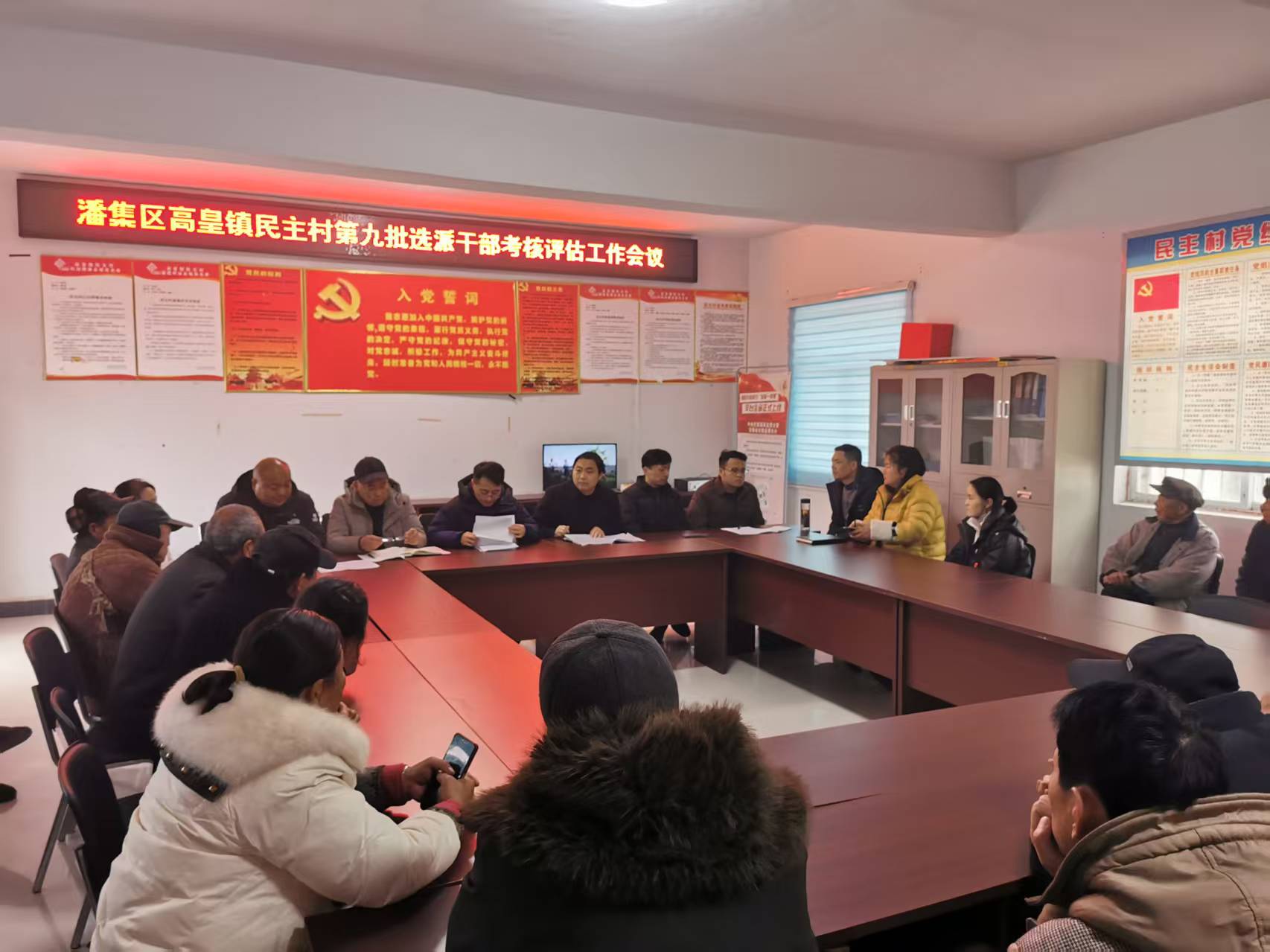 考核采取工作述职、意见征求与通气、满意度测评、个别谈话、资料查阅、实地查看、“一票否优”等相结合的方式进行,主要考核驻村工作队履行职责、作用发挥、帮扶成效、群众评价等多方面的情况。考核会上,大唐田家庵发电分公司驻村第一书记围绕宣传党的政策、建强村党组织、推进强村富民、提升治理水平、为民办事服务“五项职责”进行现场述职,两名驻村队员书面述职。参会人员根据驻村干部现实表现进行满意度测评,并与部分村“两委”干部、监测户等进行个别谈话。随后,考察组一行仔细查阅了驻村工作队履职台账,包括驻村工作日志、签到表等相关资料,并按照“选派干部量化考核评分细则”中组织建设、巩固拓展脱贫攻坚成果同乡村振兴有效衔接、集体经济发展情况、提升治理水平、为民办事服务、协调落实结对帮扶、党建引领信用村建设、驻村工作队加分等八个方面二十项进行评分,确保驻村工作考准、考实、考出成效。
