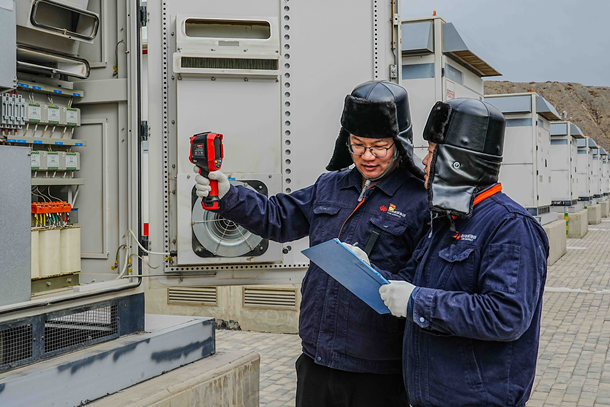 图为新疆电力乌恰风电场运维人员检查储能设备运行状态。