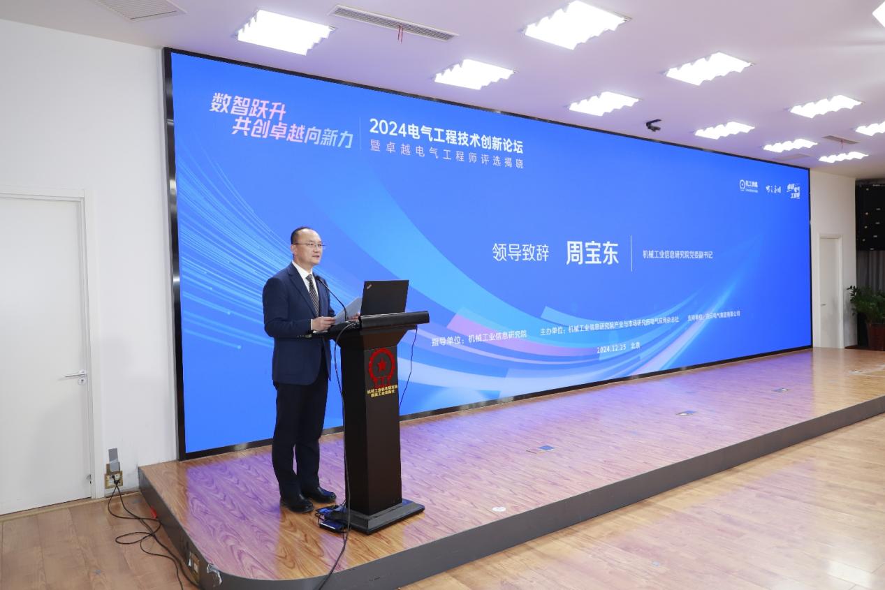 机械工业信息研究院党委副书记周宝东致辞,阐述了卓越电气工程师的评选活动及本次论坛的重要意义。他指出,随着国家“双碳”目标的明确提出,电气工程及自动化领域迎来了推动技术创新、产业升级、实现高质量发展的历史契机。在此背景下,国家实施了“国家卓越工程师计划”,旨在打造一支具有国际竞争力的工程师队伍。作为电气工程及自动化领域的一本专业期刊,此次卓越电气工程师评选活动是《电气应用》杂志履职担当、务实作为的重要行动。希望能够借此机会,建立一个资源共享、协同创新的电气工程师社区。