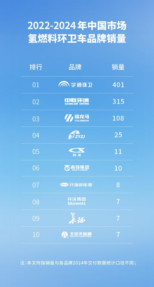 其中,氢燃料环卫车作为新能源环卫车的重要组成部分,凭借其零排放、高效率、长续航等优势,近几年成为城市环卫工作的新宠,特别是在2024年实现了爆发式增长。全年燃料电池环卫车销量达到557辆,较去年增加417辆,实现了同比290%的大幅增长。据中汽研2022-2024年中国市场氢燃料环卫车品牌销量数据显示,宇通环卫以401辆的骄人成绩稳居榜首,再次彰显其在新能源环卫设备市场的引领地位。