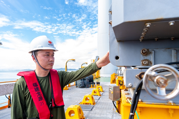 2024年6月,龙源电力全球首个风渔融合浮式平台“国能共享号”在福建莆田海域成功投产发电。这个海上“新物种”由漂浮式平台、4兆瓦浮式风机等系统组成,巧妙利用平台中间六边形区域进行深海养殖。在首批1万尾大黄鱼鱼苗成功投放后,林燊的工作职责除了海上风电运维,又多了一项“养鱼”。