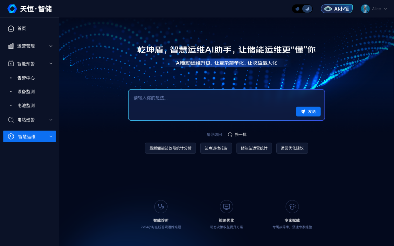 为解决储能站业主建立一体化运维能力的需求,天恒·智储平台提供全景驾驶舱功能,将复杂的资产分布、运维状态与运营收益简化至“一屏阅览”。此外,通过全球首创的针对单站问题的全时专属服务助手—AI小恒,可基于单个储能站画像数据,提供1V1深度解答,并可与平台其它功能模块进行联动直接闭环处理,助力客户实现少人值守与高效管理,为行业树立智慧运维新标杆。