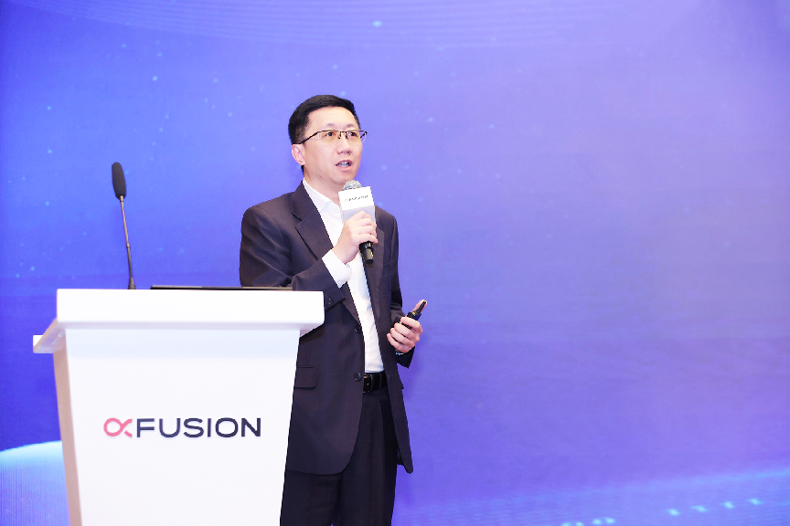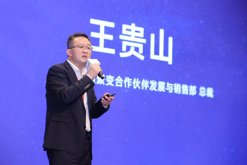 超聚变合作伙伴发展与销售总裁王贵山致辞,他表示:“超聚变坚持‘同信念,创价值,共成长’的生态合作理念,基于业务实质以及价值创造与价值分配对等的基本原则寻求同路人同心聚力,共同发展。”