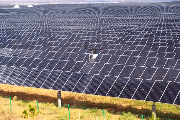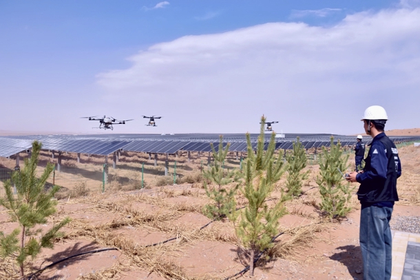 如今,1台无人机每天可清洗6000块组件,相当于7名工人的日工作量。更令人惊喜的是,清洗用水自然下渗,滋养了板下植物,避免了水资源浪费,形成了“清洁-发电-固沙”的良性循环。