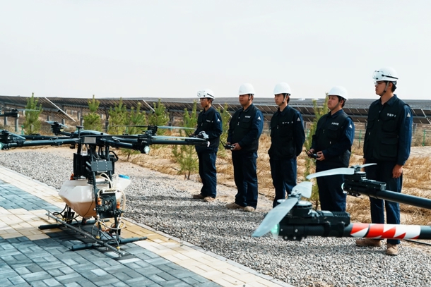 无人机清洁只是该基地科技创新的冰山一角。刘源介绍,公司围绕基地规划、设计等方面,率先开展新技术、新材料、新工艺的应用研究,构建了“沙戈荒”基地建设标准体系,推动了一系列新能源大基地智慧化项目研究成果落地。