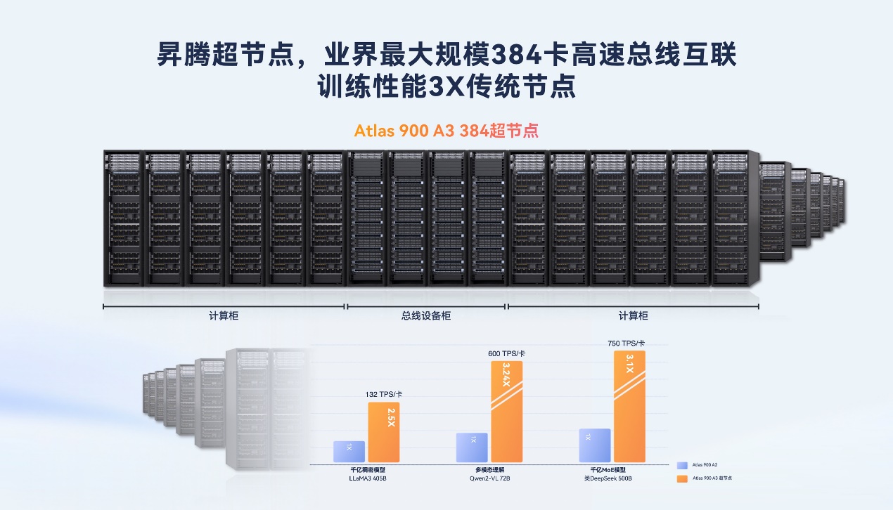 昇腾超节点架构以突破性创新打破集群互联瓶颈,通过技术革新实现节点间高效协同,让集群运行如同一台强大计算机,大幅提升整体计算效率。其构建业界最大规模384卡高速总线互联体系,相比传统节点,训练性能实现3倍飞跃,以强劲算力支撑大规模AI任务快速推进。同时,超节点架构深度适配MoE,充分释放MoE模型潜力,为模型训练与推理提供高效支持,使昇腾成为MoE模型开发与应用的最优选择,在AI计算领域树立新标杆。