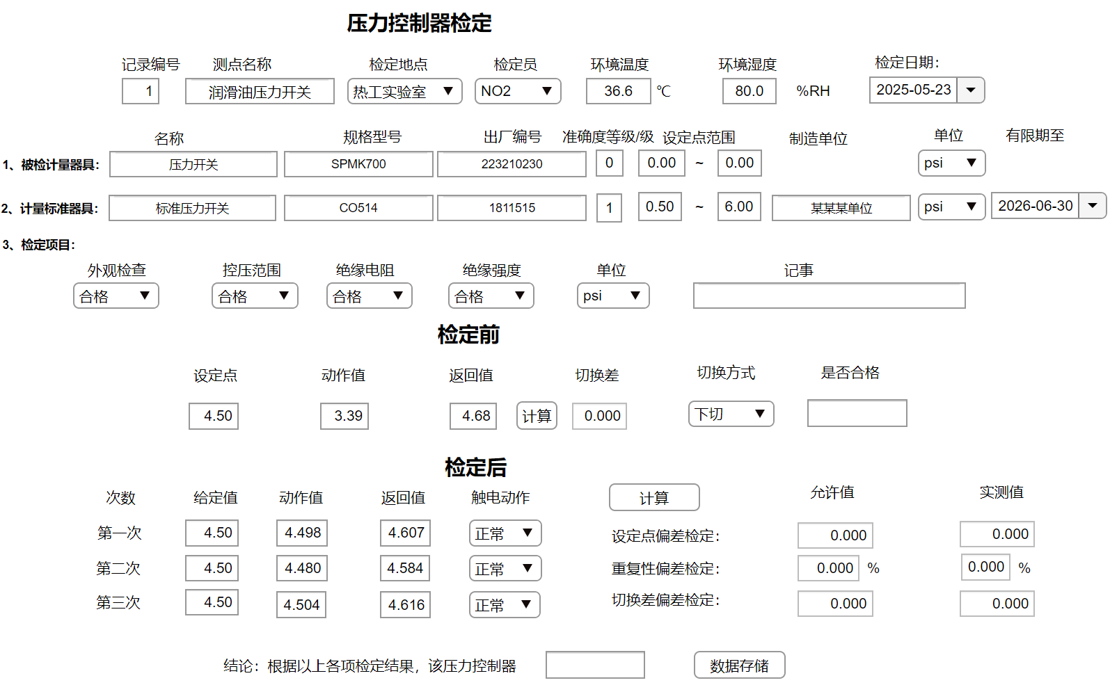 压力控制器校验计算软件具备数据存储功能,可自动保存每次校验数据,便于后续数字化归档与分析;自动报错功能能及时发现校验过程中的异常,有效避免因数据错误导致的误判,实现计算正确率100%,为压力控制器等仪表校验提供了精准、可靠的技术保障。