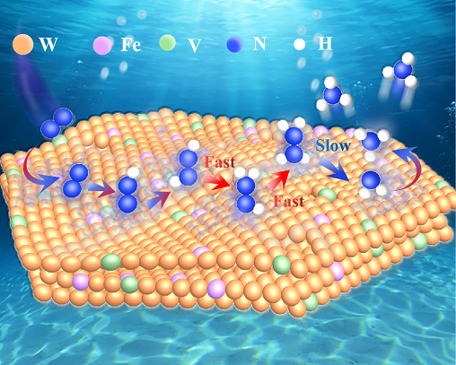 铁、钒双掺杂三氧化钨催化氮气还原生成氨流程示意图。