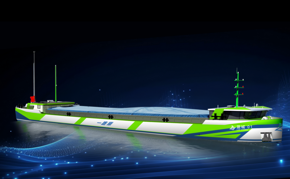 适配长江干线及支流航道的纯甲醇电动智能船舶效果图。