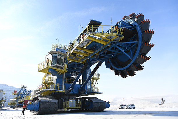 今年1月5日,全国首套国产纯电轮斗连续采煤系统在宝日希勒矿单机重载调试成功,煤炭被铲斗采掘后,经过受料臂、中心漏斗,最后通过排料臂漏斗传送到指定位置。