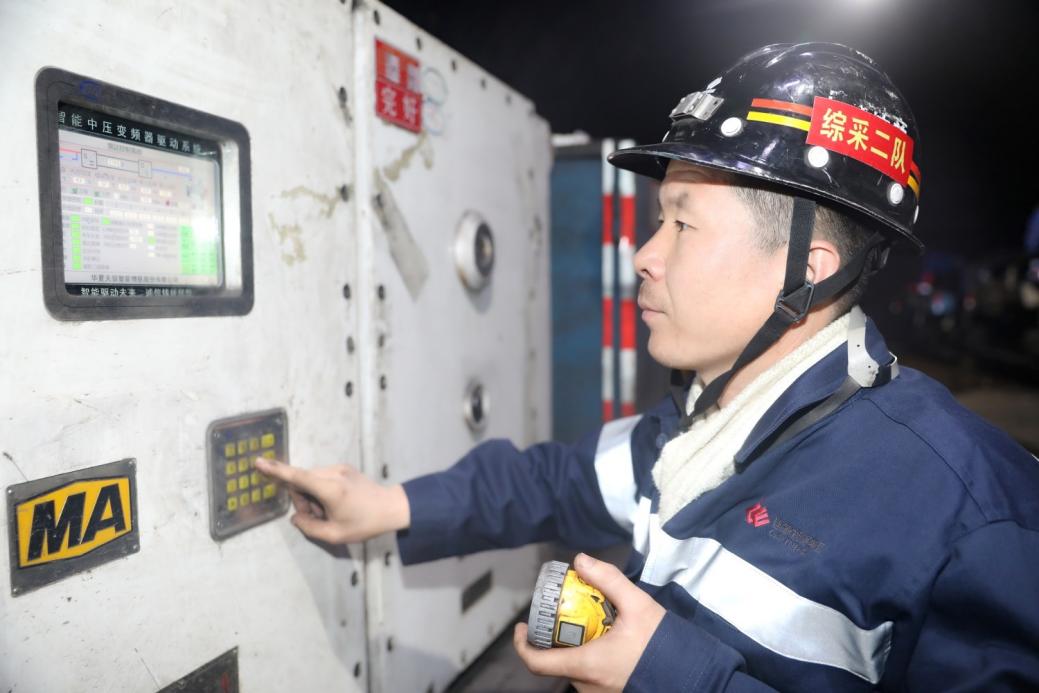 下午5时,红柳矿综采队员工马建华坐在智能化采煤系统操作台前,一键启动井下综采工作面生产。