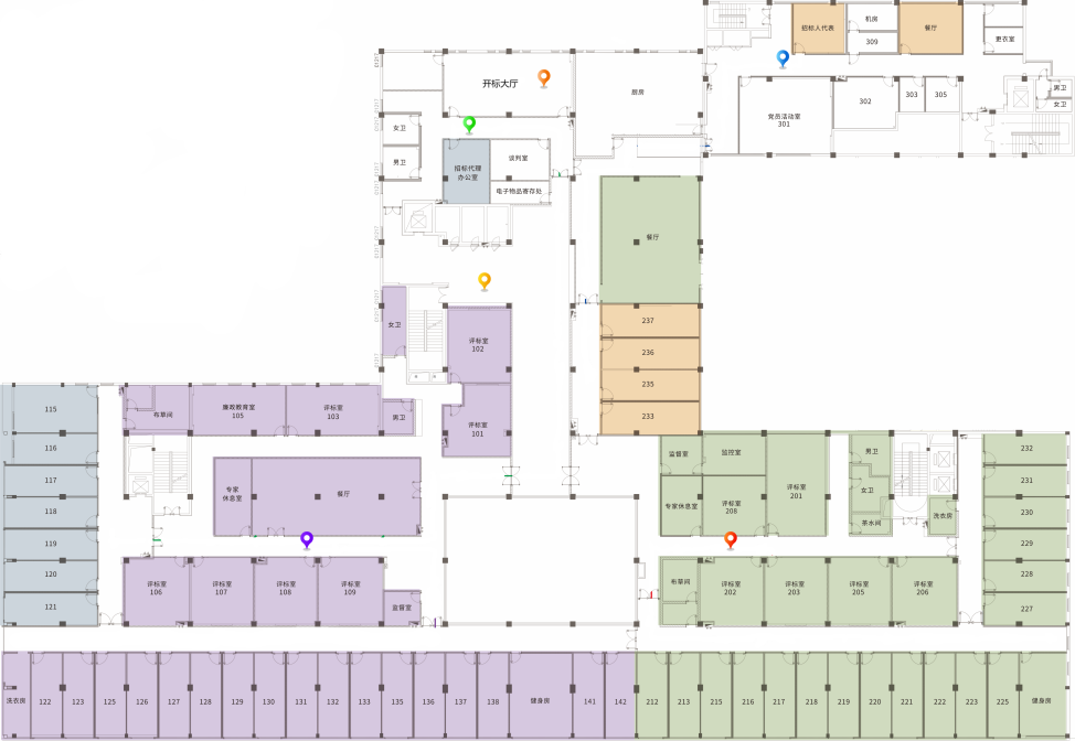 基地除严格执行国网公司提出的招标人代表、技术组、商务组、招标代理机构人员工作、用餐、住宿场所之间的“硬隔离”要求,还配备了电子围栏系统、紧急报警系统、加密录音电话等“软隔离”设施,并着重优化了其中的电子围栏模块。评标期间,模块将四类人员设置为红、绿、蓝、黄四种颜色,以及不同门禁权限和安全距离。当不同颜色人员定位显示小于系统预设的距离或发生违规聚集,电子围栏会第一时间自动发出预警。