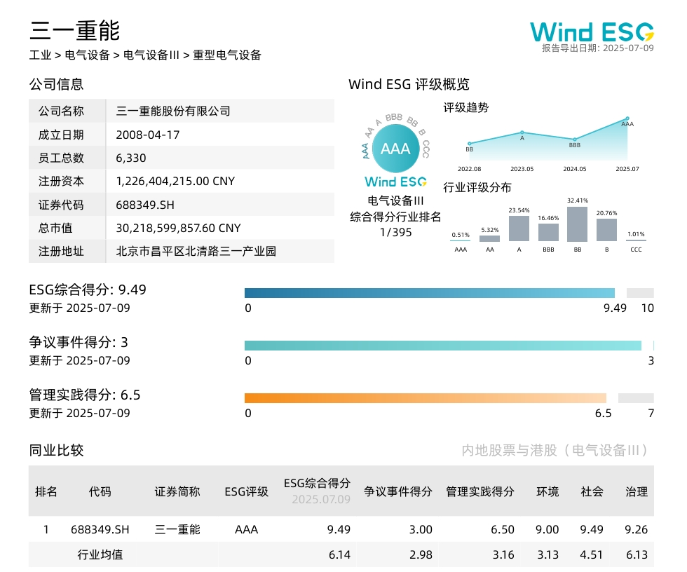 在备受关注的Wind ESG评级中,三一重能凭借在环境、社会及治理维度的卓越表现,荣膺最高AAA评级,综合得分高达9.49分(满分10分),在电气设备395家入选企业中位列榜首。这不仅是对三一重能长期深耕ESG管理的权威认证,更印证了其可持续发展体系已走在行业最前列。