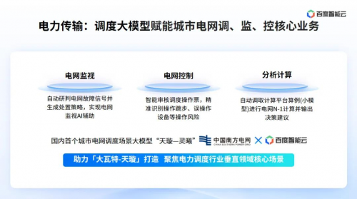 电力传输侧:今年5月份,百度智能云助力南网深圳供电局发布了国内首个城市电网调度场景大模型 “天璇 — 灵曦”,它是基于南网“大瓦特—天璇”电力调度大模型底座搭建的,可实现自动研判故障、生成处置策略、智能审核调度操作票以及调取算例进行N-1计算,已经投入电网调度生产业务并发挥了实效。