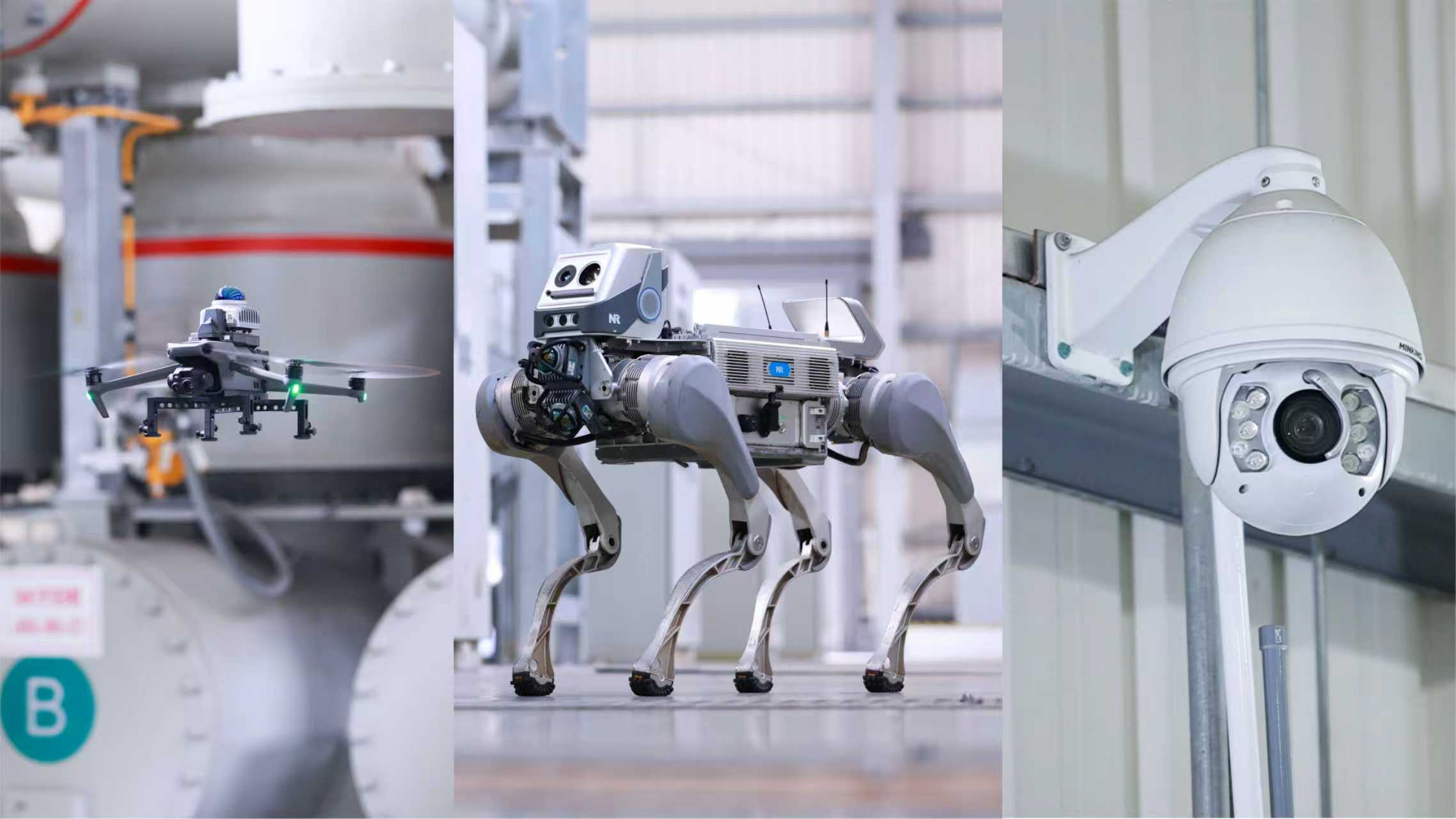 无人机飞行于设备高处与缝隙,精准判断刀闸状态,实时监测关键部位温度,识别精度达±0.1摄氏度。机器狗深入视觉死角,精准采集液压油位、SF6压力等20多类数据,实现巡检点位100%覆盖。50余处高清摄像头构建起24小时不间断立体监测网络,典型异常识别准确率达98.5%。