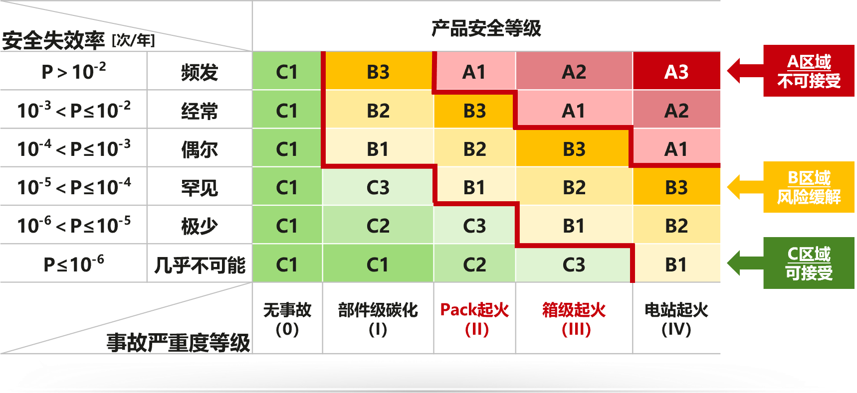 华为数字能源联合提出的评估体系将储能系统安全风险由高至低分为A(不可接受)、B(风险缓解)、C(可接受)三个等级,并明确了各等级对应的失效概率要求。其中,A级风险极高,系统安全风险完全不可控,重大安全事故概率极高;B级风险较高,必须通过持续优化产品设计与引入创新技术以降低风险;C级为安全风险总体可控,可有效避免整站火灾等严重后果。