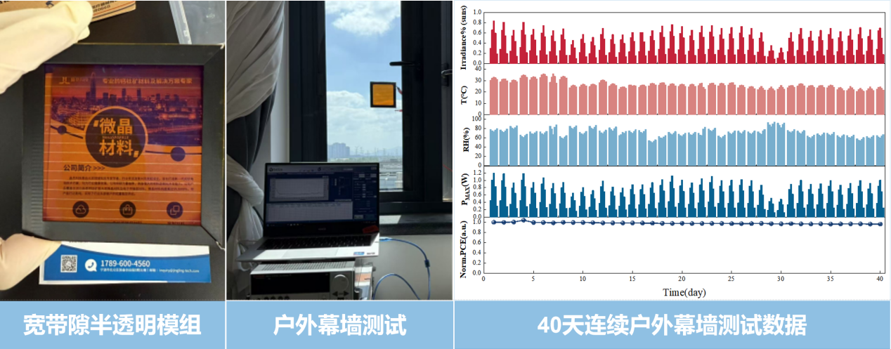 这款半透明钙钛矿模组选用了高纯度电子级钙钛矿微晶原料,经封装后,在户外幕墙长达40天的连续测试中,效率衰减小于5%,稳定性远超行业平均水平,完美平衡了效率与透光性,实现了优异性能表现!